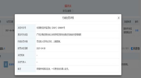 该公司违法行为类型为“广告含有妨碍社会公共秩序和违背社会良好风尚的内容和情形”,主要违法事实为“食品、化妆品等宣传功效”,行政处罚内容为“罚没款人民币53万元,上缴国库”,作出行政处罚决定日期为2021年4月8日。