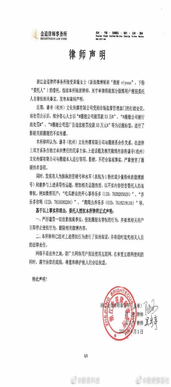 对于上述行政处罚信息,薇娅团队迅速发布声明,并与谦寻文化撇清关系。薇娅回应表示,谦寻(杭州)文化传媒有限公司与薇娅系是合作关系,在法律上双方系各自独立承担责任的民事主体。部分网络媒体将两者混淆对薇娅本人造成名誉权侵害。谦寻(杭州)文化传媒有限公司与薇娅本人并不等同。