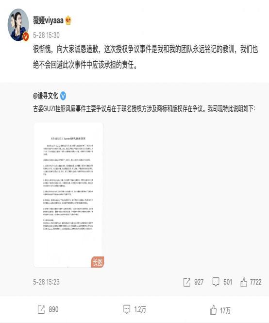 此外,薇娅也公开道歉:“这次授权争议事件是我和我的团队永远铭记的教训,我们也绝不会回避此次事件中应该承担的责任。”