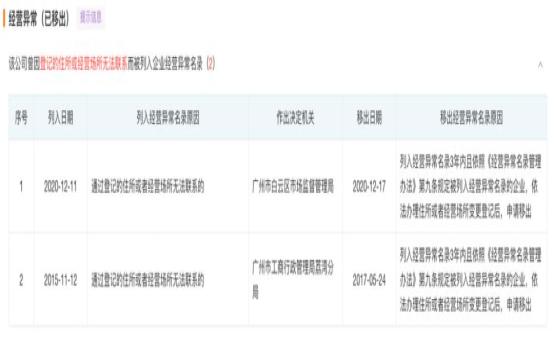 2015年11月12日,该公司被广州市因“通过登记的住所或者经营场所无法联系”被列入经营异常名录,作出决定机关为广州市工商行政管理局荔湾分局,直到2017年5月24日才被移出经营异常名录。