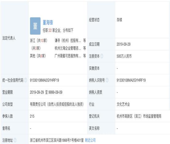 据天眼查数据显示,谦寻(杭州)文化传媒有限公司成立于2019年9月,注册资本500万人民币,薇娅丈夫董海锋为其法定代表人、疑似实际控制人。