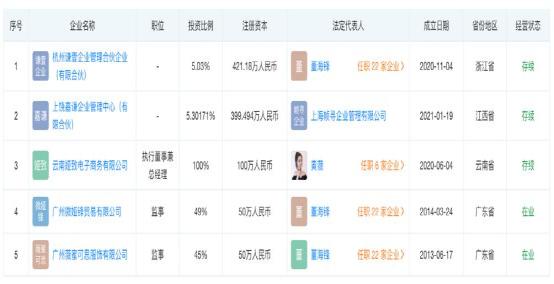 值得注意的是,“头顶光环”的薇娅不仅带火了直播,还悄悄涉足私募股权投资领域。查询显示,谦寻(杭州)控股有限责任公司今年4月再度进行了工商变更,投资人新增海南云锋拓海基金中心(有限合伙),持股比例显示5%。这也就是说继君联资本入场后,知名PE云锋基金也低调入股了该公司。