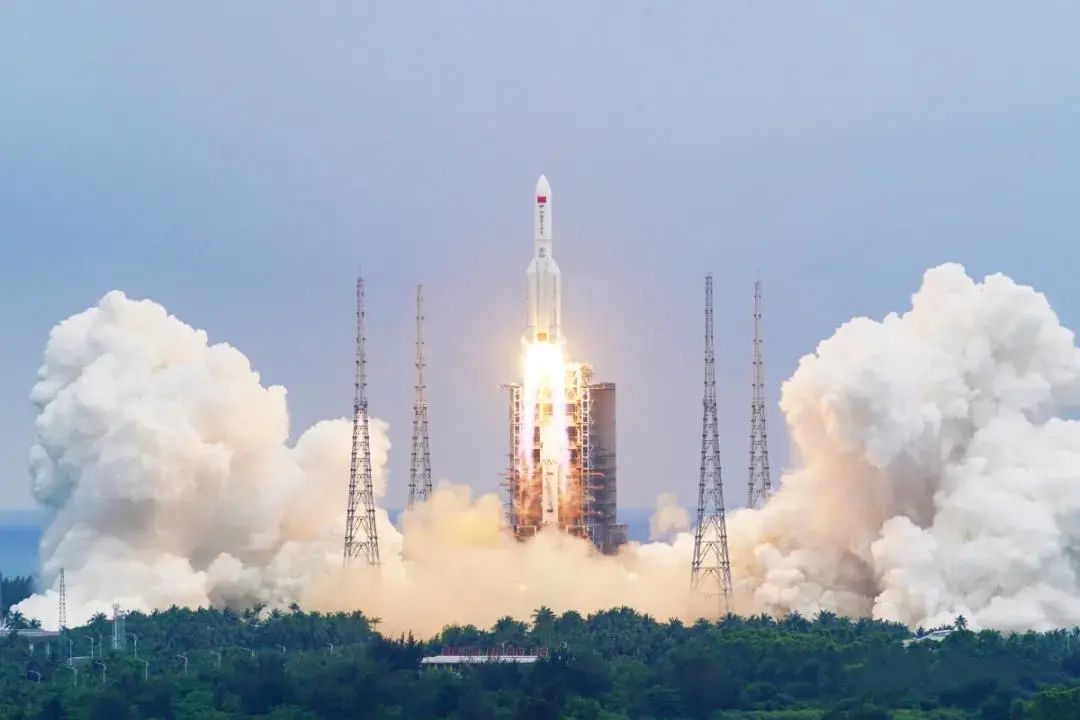 ▲2021年4月29日11时23分许,搭载空间站“天和”核心舱的长征五号B遥二运载火箭,在我国文昌航天发射场点火升空。图据中国航天科技集团官方微信公众号