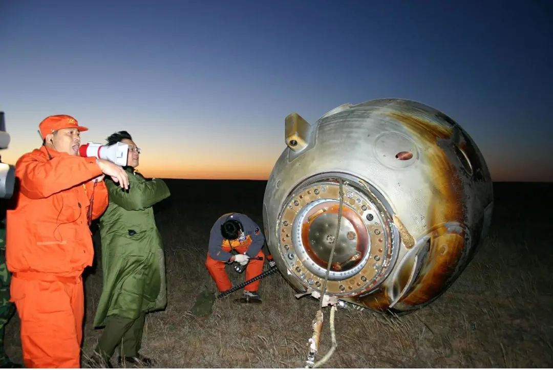▲2003年10月16日,内蒙古四子王旗北部的阿木古郎牧场,中国第一艘载人航天飞船“神舟五号”着陆,降落在预定的着陆场。图据视觉中国