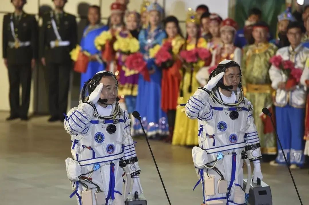 ▲“神舟十一号”航天员景海鹏(左)、陈冬在出征仪式上敬礼。图据《中国航天》杂志官方微信公众号