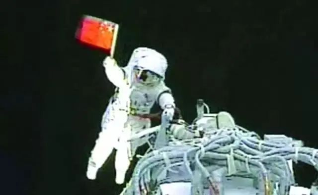 ▲2008年9月,“神舟七号”飞行任务中,航天员翟志刚圆满完成我国首次空间出舱活动,挥舞国旗。图据《中国航天》杂志官方微信公众号