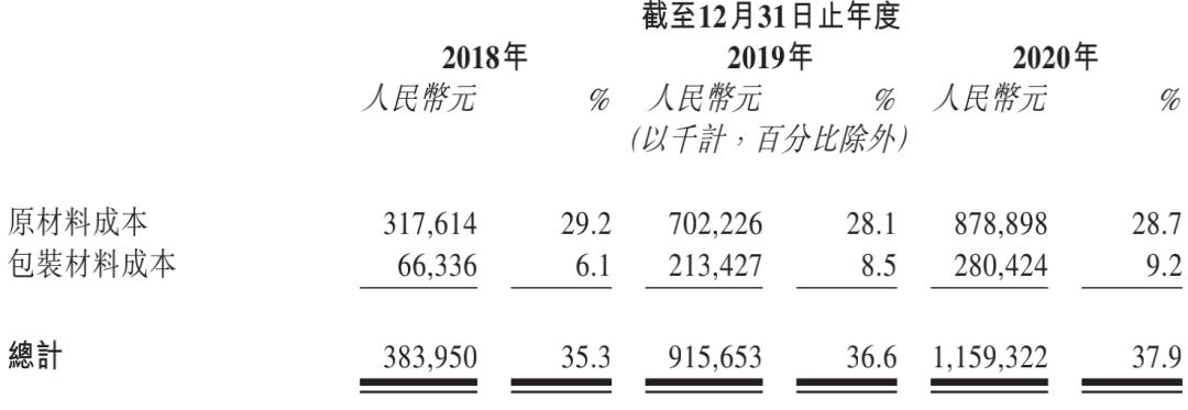 但从材料成本构成来看,2018年至2020年,由水果、乳制品等构成的原材料成本占比收益比例分别为29.2%、28.1%和28.7%;而包装材料成本则占比收益比例分别为6.1%、8.5%和9.2%,显示包装成本增速远远超过原材料成本。