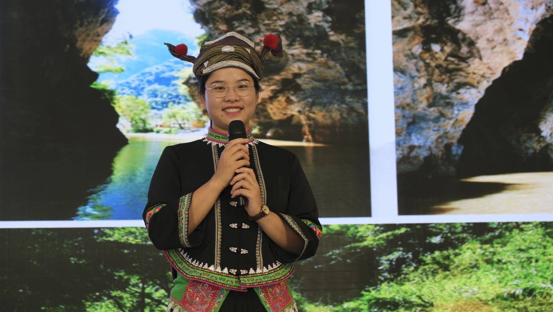 广南民族文化旅游产业有限公司的张静伊带着嘉宾坐着画舫船,穿过幽深的溶洞,伴着桨声灯影,经过短暂的幽暗,竟是豁然开朗,土地平旷,阡陌纵横,屋舍俨然。扑面而来的,分不清是桃花的馥郁还是稻花的清香;缓缓流淌的,说不清是小院里的炊烟袅袅或是峰峦下的薄雾轻扬。造物主在广南绘就了这样一幅水墨图卷——坝美世外桃源。