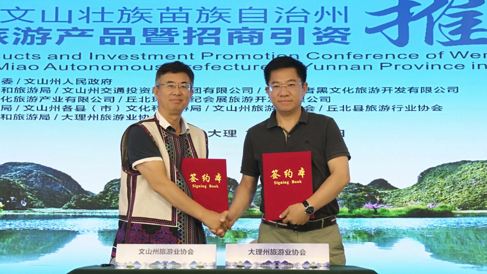 现场,文山州旅游协会会长许青和大理州旅游行业协会常务副会长兼秘书长傅东寅(图右)签订了旅游战略合作协议。