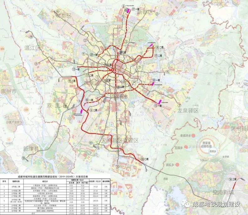 根据成都地铁第四期规划。成都地铁目前在建项目有8号线二期、10号线三期、13号线一期、17号线二期、18号线三期、19号线二期、27号线一期、30号线一期工程等8个项目,总长176.65公里。成都地铁第四期8条地铁线路和轨道交通资阳线同时在建总长度为215.67km。2025年成都轨道交通运营及在建里程将达850公里。