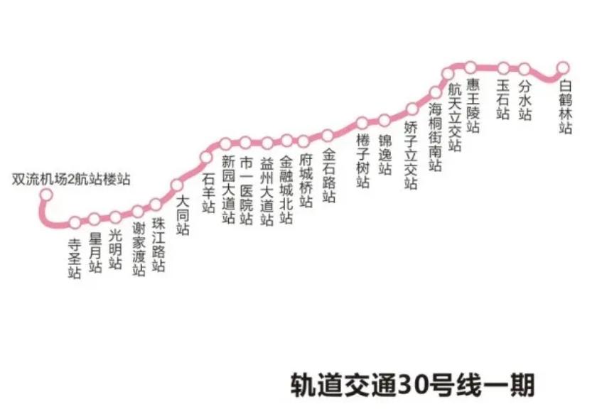 成都地铁30号线一期起于双流机场2航站楼站~止于白鹤林站,途经双流区、高新区、锦江区、龙泉驿区,工程线路长约26.284km,共设23座车站(不含龙泉站)。建成后将改善了沿线居民公共交通出行条件,加强成都南部东西向交通联系,引导城市向东发展,为“东进”战略提供支撑,完善成都市轨道交通网络。