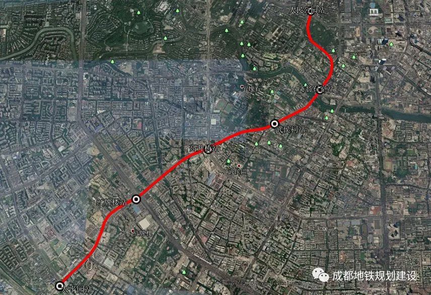 成都地铁10号线三期线路北起人民公园站,车站位于人民公园西北侧,跨2号线车站、少城路设置,与地铁2号、17号线换乘。出站沿文翁路南行,至锦江北岸设文翁石室站,与地铁13号线换乘。之后下穿锦江,沿通祠路、武侯祠大街往西南方向前行,于武侯祠东侧、省交通运输厅门口设武侯祠站,于武侯祠西南侧、一环路路口东侧设高升桥站,与地铁3号线、5号线换乘。出站后沿高升桥路往西南前行,于红牌楼广场附近设红牌楼站,与地铁3号线换乘。之后沿佳灵路继续向南敷设,接入10号线一期工程起点太平园站。
