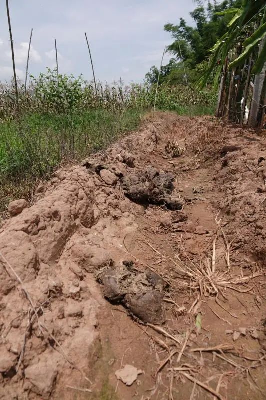 “昨天晚上大象顺着那边的林子下到寨子旁边,从火龙果地、玉米地、水田一路走过来,在农地里寻找吃的,还踩坏了我家水田里的部分秧苗。”