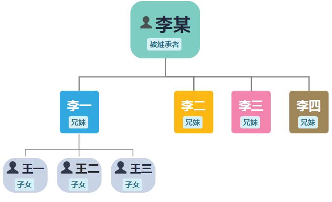 被继承人李某去世时无配偶、子女,其父母早于李某去世。但李某有兄弟姐妹,分别是李一、李二、李三、李四。李一先于李某去世,李一共生育子女三人,即王一、王二、王三。