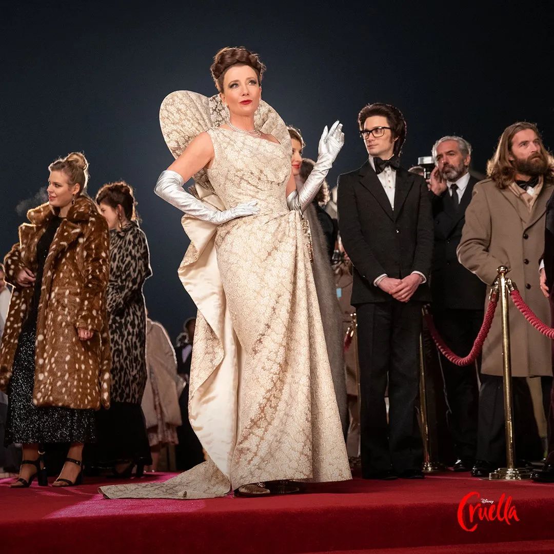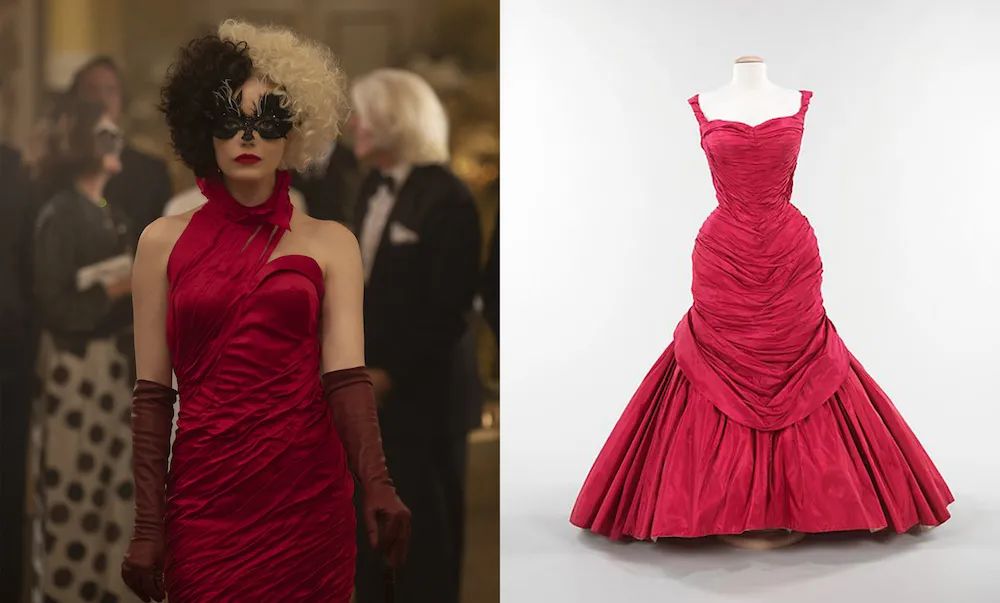 现实中,这条红裙子的灵感来自天才礼服设计师 Charles James 一条名为“Tree”的裙子,有层叠的贴身褶皱和松散的下摆,领口被改成不对称的火焰设计,更增添了库伊拉浴火重生的妖冶。