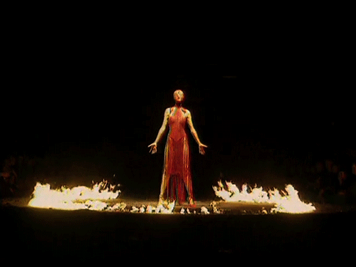 麦昆在学生时代受到批评时,时常一把火烧掉自己的作品,后来在 1998 年秋冬季“被诅咒的女人”主题秀场上,他将这把火带到了模特身边,一烧成名。