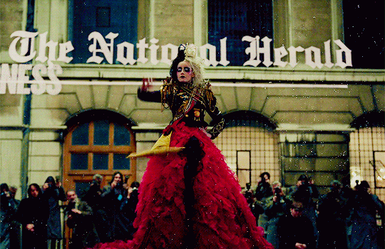 这条裙子的裙摆足有 12 米,里面是黑色的纱裙,外面是红色花瓣,库伊拉用了类似军装制服的上衣来搭配,肩膀上有立体的马车装饰,别满锁链徽章,气场爆棚。