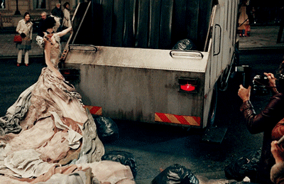 扔下一堆垃圾袋,穿着印有自己报道的“报纸裙”,拖着长达 40 英尺的裙摆拉在车后闪亮退场。