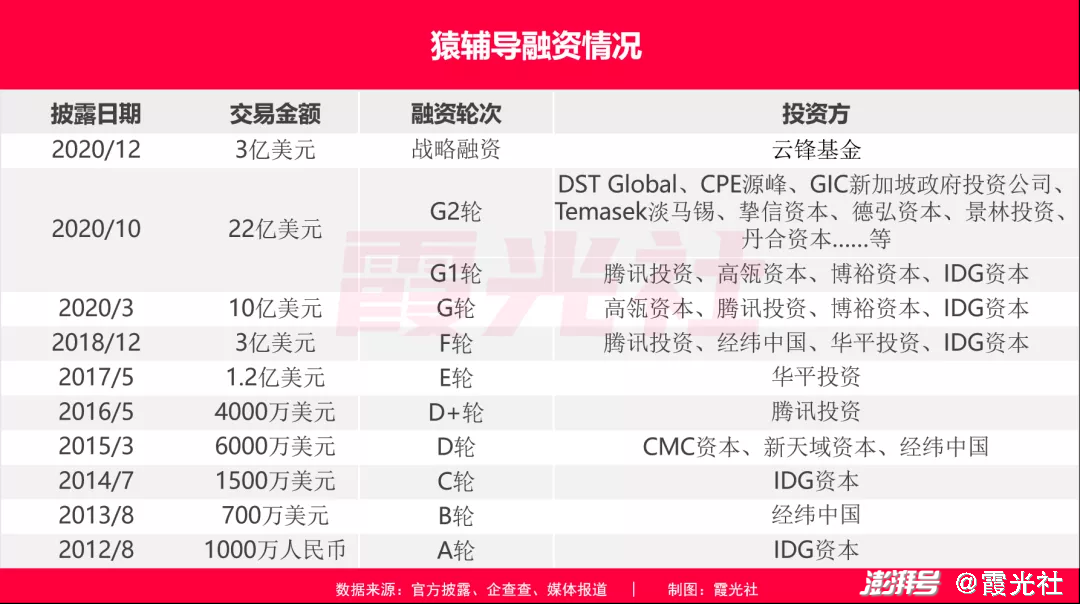 10月,猿辅导完成了G+轮22亿美元融资,估值达155亿美元。伴随着官宣,猿辅导也披露了目前用户规模,包括猿辅导、斑马AI课在内,目前正价在读学生人次共计370万左右,“是目前国内网课用户规模最大的在线教育公司”。就在2020年3月李勇发表CEO公开信时,这个数字还仅是150万。