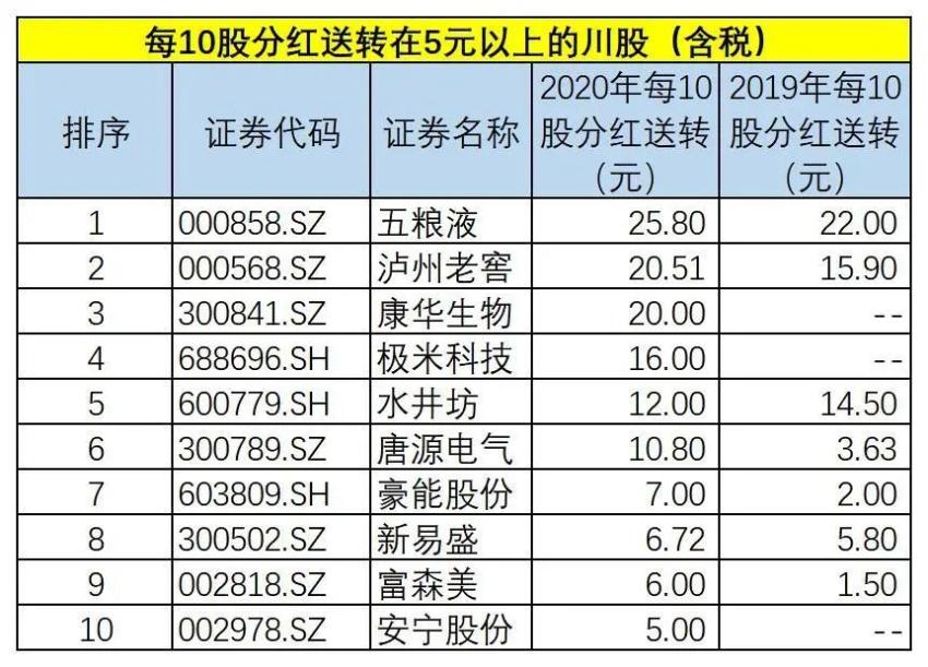 这其中,分红最为豪气的是五粮液,排在一众川股之首。根据该公司此前发布的2020年年度权益分派实施公告来看,每10股派现金25.80元(含税),现金分红总额达到100.15亿元,分红比例为50.19%,创上市以来最高分红金额。