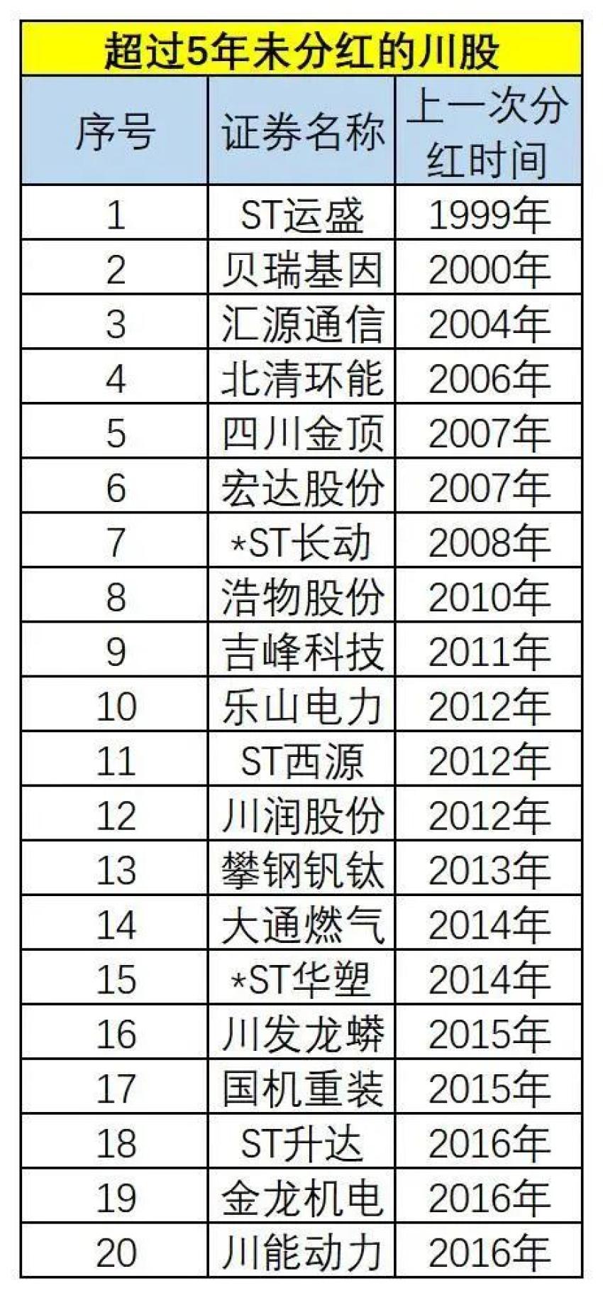 在四川的上市公司中,绝大多数公司都进行过分红,但仍有少部分不注重分红的企业。据梳理统计显示,今年仍未公布分红方案的企业有52家。从过往分红情况来看,有20家公司连续5年未进行过分红。这其中1996年上市的ST运盛,上市以来仅分红过一次,至今已经21年;而贝瑞基因上一次分红还是2000年。