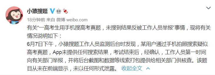 有关“一高考生用手机搜高考真题,未搜到结果反被工作人员举报”事情,现将有关情况说明如下:6月7日下午,小猿搜题工作人员监测后台时发现,某用户通过手机拍照搜索疑似高考真题,App未提供任何搜索结果,考试结束后,经确认,工作人员第一时间向有关部门举报,并将后台截图和数据等线索打包提供给相关部门供核查。该题目从未在前端显示,未以任何形式泄露。