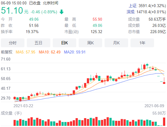 今日开盘后,朗姿股份一度止跌回升。截至收盘,其报51.1元,股价小幅下滑了0.89%。