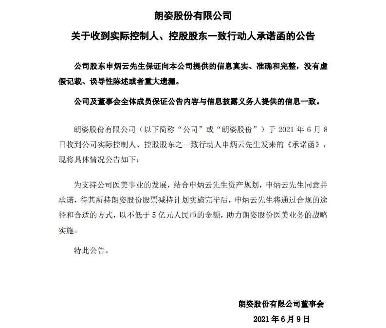 当天,朗姿股份还表示于6月8日收到申炳云发来的《承诺函》,引来投资者的关注。《承诺函》显示,为支持公司医美事业的发展,结合资产规划,申炳云同意并承诺,待其所持朗姿股份股票减持计划实施完毕后,将通过合规的途径和合适的方式,以不低于5亿元的金额,助力朗姿股份医美业务的战略实施。
