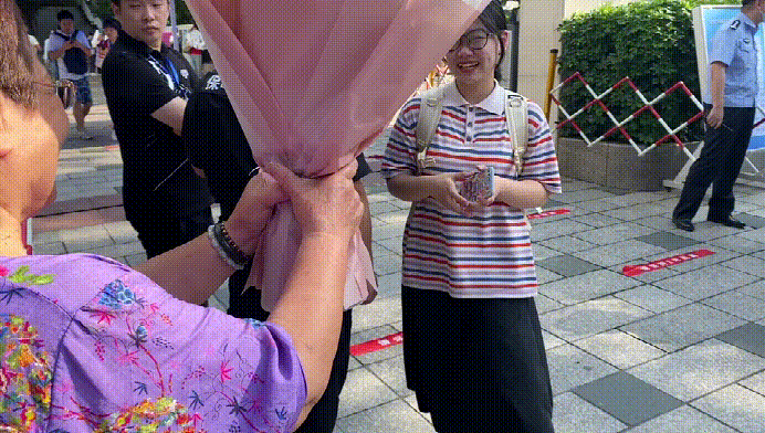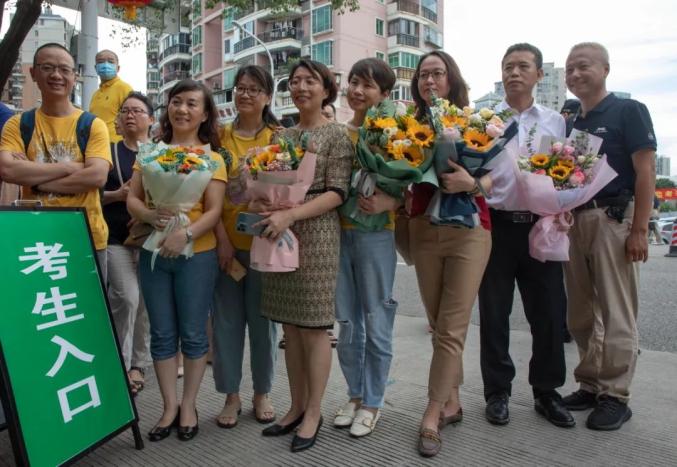 在考场外,很多家长都抱着花、举着手机等候着