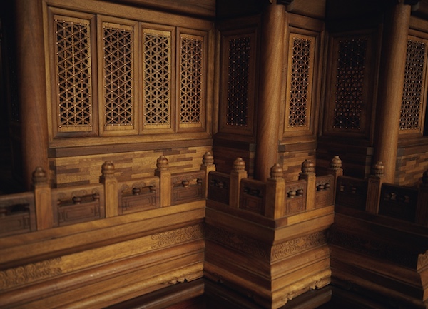 还有,角楼的门窗扇上的扇心,做的都是三交六碗花菱子,这“三”、“六”又是“九”的分解数;当然,梅花钉是每组七钉;台基上的台阶是七步;有兴味的是,无论站在角楼的哪一面看角楼,左、右都各显七个翼角;当进入室内,仰视中厅上方的天花板时,可知天花板数是九九八十一块,最大阳数相乘之积;大抱厦天花板是七、四之积二十八块;小抱厦天花板是九块整的,外加九块半个的,因它是小抱厦处阴位,但也给“九”以扶之。再看室内地砖,室内铺墁整块地砖四百五十块,正为十倍的“至尊之数”。