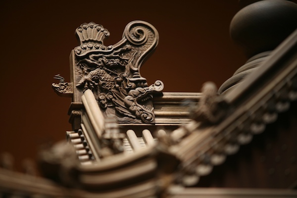 再看飞檐角上有一个仙人,他坐在一个似兽非兽、似凤非凤的长着鱼尾的兽上。有人传说那仙人是封神的姜太公,有他在可以镇邪消灾;也有人传说那仙人是禹王,因屋脊聚龙太多,易发大水,所以禹王在此镇之。