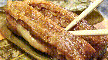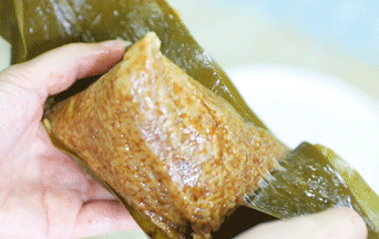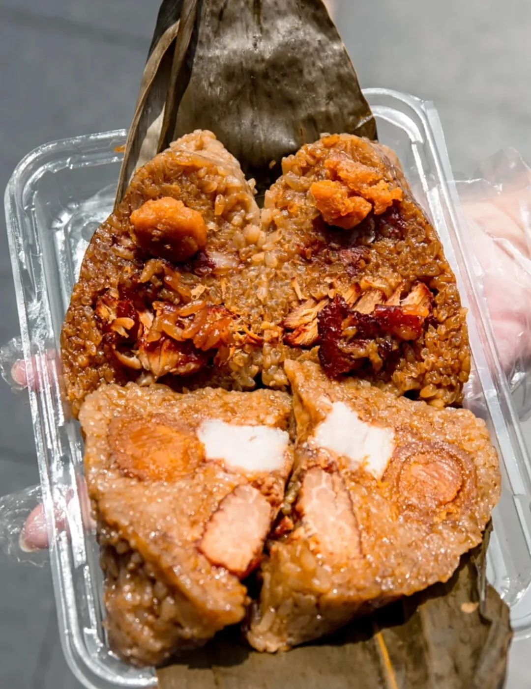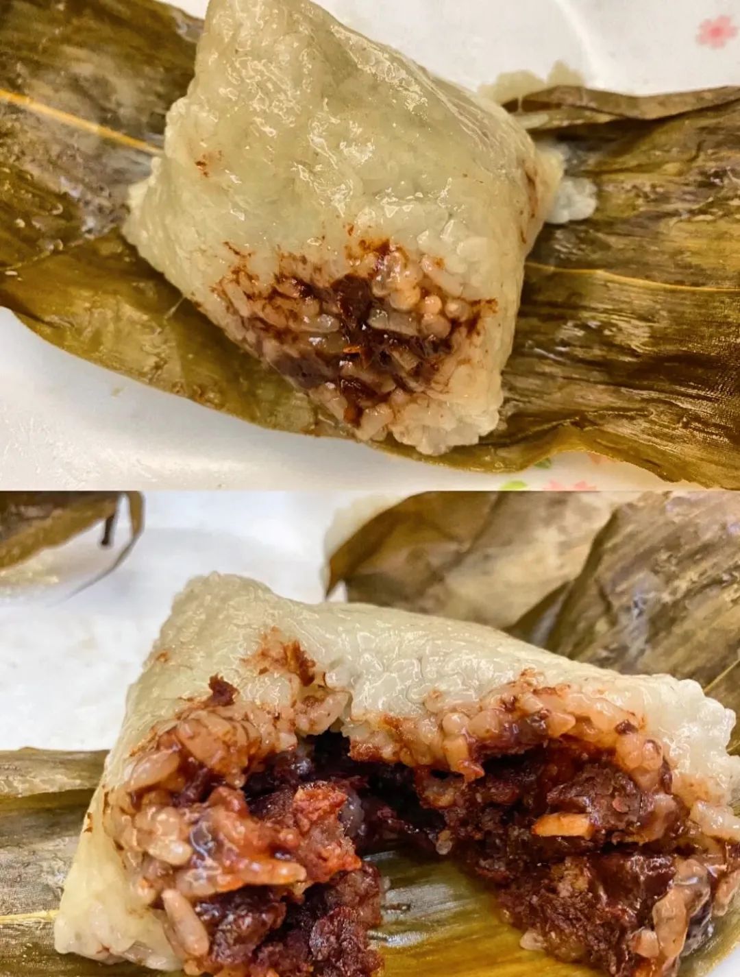 肉眼可见的超多梅干菜平铺在粽子上,配合着超大块五花肉也丝毫不会感到腻哦~喜欢吃咸口的朋友们一定要试一下。