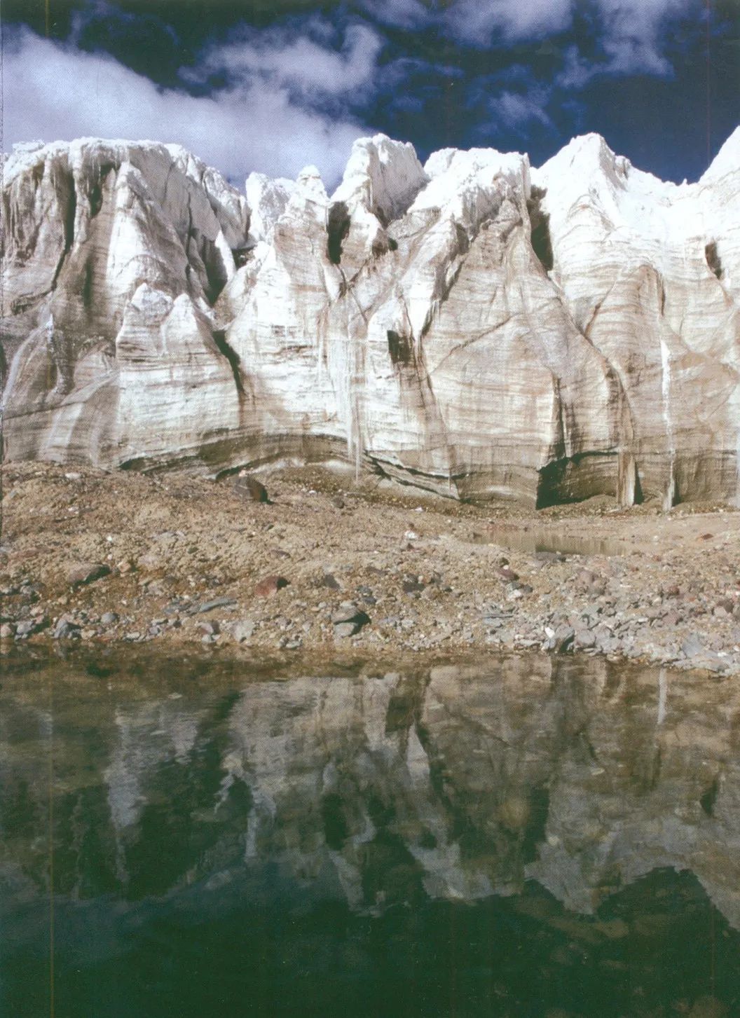 奇异的冰川世界,千姿百态,晶莹夺目。冰川尾部形成的冰塔林,犹如千万顶白色帐房,远远眺望,景色十分壮观。丰富的冰雪融水汇集成无数条涓涓细流,蜿蜒交错,大小湖泊熠熠发光。