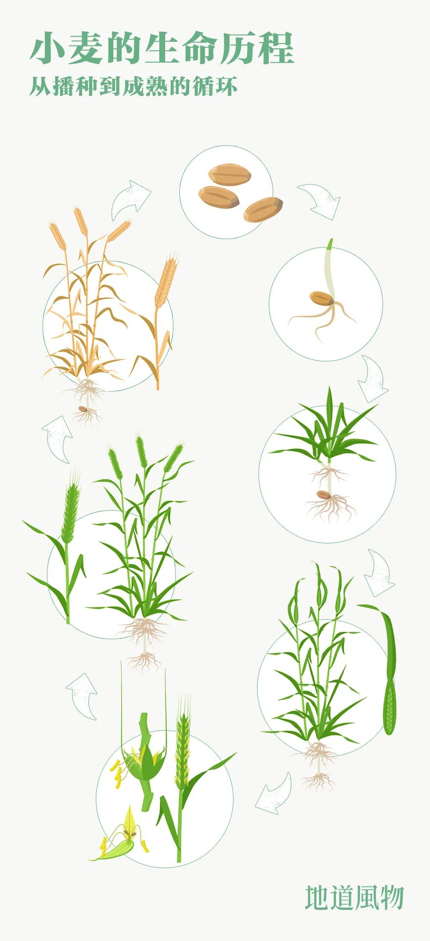 ▲ 小麦一生会经历种子萌芽、出苗、生根、长叶、拔节、孕穗、抽穗、开花、结实,到产生新的种子;小麦从播种到成熟一般需要230-270天。 制图/刘航