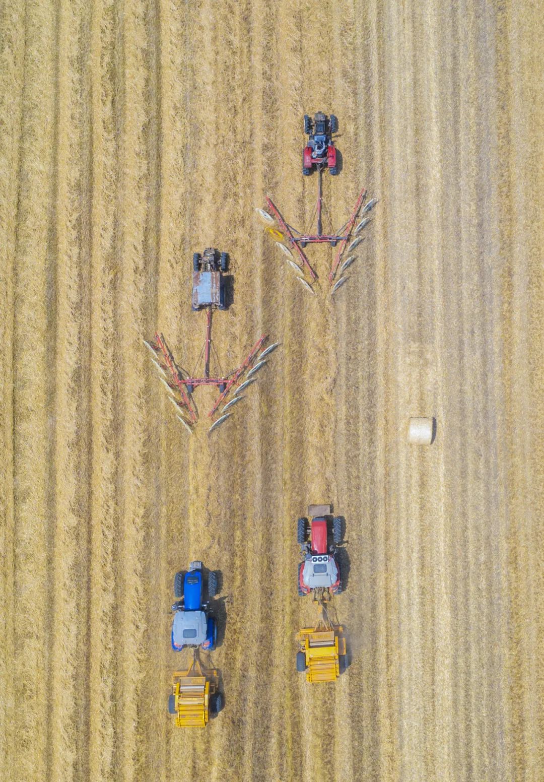 ▲ 江苏收割机、搂草机和打捆机来回穿梭繁忙的丰收景象。 图/视觉中国