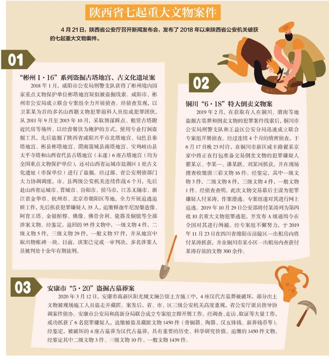 据陕西省公安厅数据,自2018年以来,该省公安机关共破获各类文物犯罪案件1093起,其中大要案件18起;打掉文物犯罪团伙123个,抓获A级通缉犯16人,打击处理犯罪嫌疑人1159人;追缴各类文物9819件,其中珍贵文物684件。