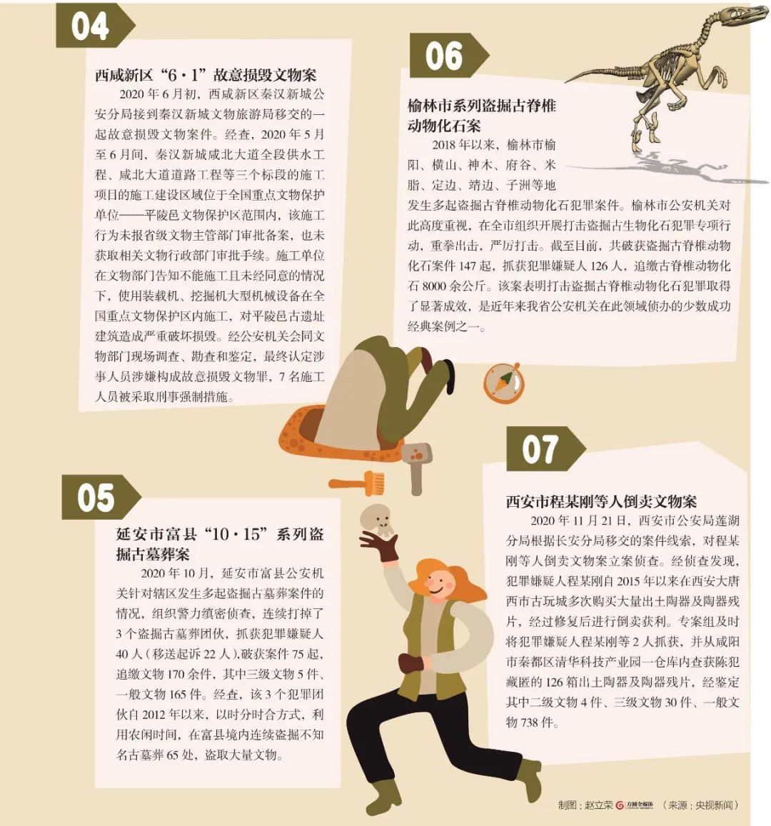 陕西省公安、文物部门也将联手行动,对盗掘古文化遗址古墓葬、盗窃盗割石窟寺石刻、盗窃古塔等文物犯罪以及盗掘古脊椎动物化石、文物套路拍诈骗、倒卖文物等犯罪进行重点打击。