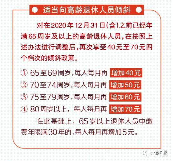 二是保证企业退休军转干部、原工商业者调整后不低于全市养老金的平均水平。按照定额、缴费年限增加基本养老金和按绝对额增加基本养老金后,企业退休军转干部、原工商业者基本养老金低于调整后全市企业退休人员养老金平均水平的,补足到平均水平。同时,在2020年12月31日(含)之前已经年满65周岁及以上的高龄退休人员,还享受高龄退休人员的倾斜政策。