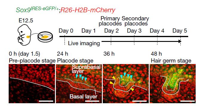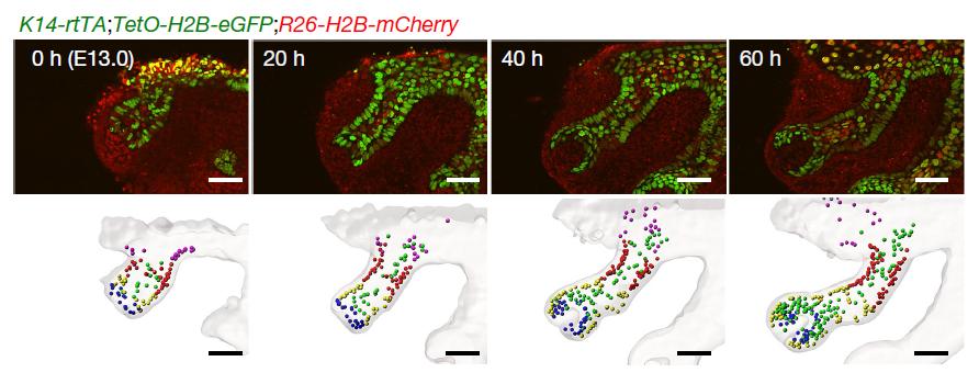 在这项研究中,研究团队优化了一种称为实时成像的技术,以记录从受孕后11.5天开始在小鼠胚胎中提取的培养皮肤组织中细胞的运动。研究人员用3到5天的时间对皮肤样本进行三维和微观成像,从而制作出毛囊发育的延时视频。通过反向播放这些视频,研究人员追溯了完全生长的毛囊细胞的胚胎基板起源。