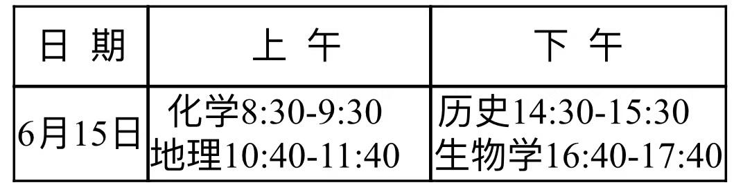 高一年级学生合格性考试统一报考化学、地理、历史、生物学四科。各科考试内容以《普通高中课程方案和语文等学科课程标准(2017年版)》相关规定为依据。各科目考试具体时间安排如下: