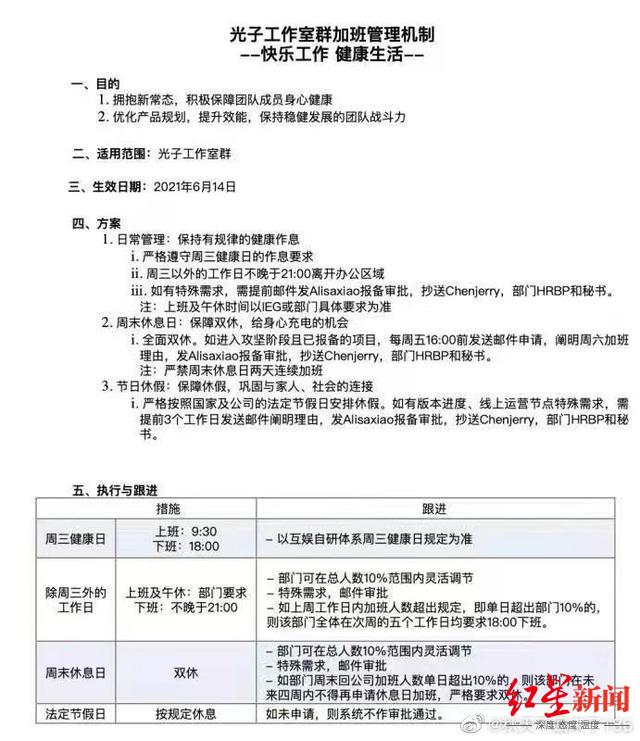 具体来看,自6月14日起,光子工作室将严格遵守周三健康日,周三18:00下班,其他工作日不晚于21:00离开办公区域,如果有特殊需要提前报备审批。此外,周末全面双休,节假日休假严格按照国家法定节假日安排休假。