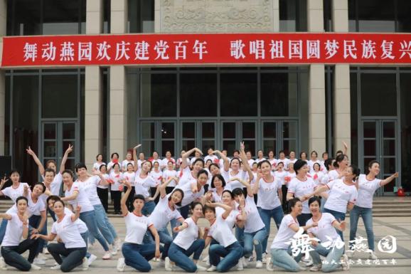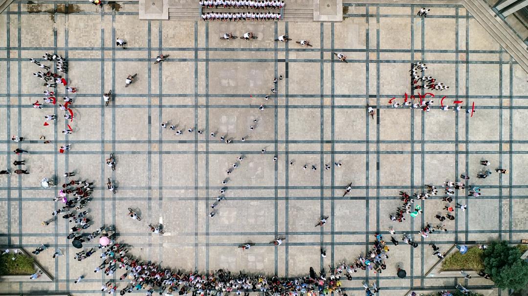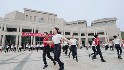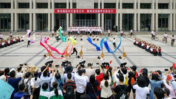 领唱老师的歌声高亢嘹亮——“唱支山歌给党听”的旋律渐起,年轻的舞者从广场四周向中央聚拢,灵动曼妙的舞姿吸引着大家的目光。她们将舒展双臂,热情洋溢,神采飞扬,灿烂的笑容点亮了讲堂广场。