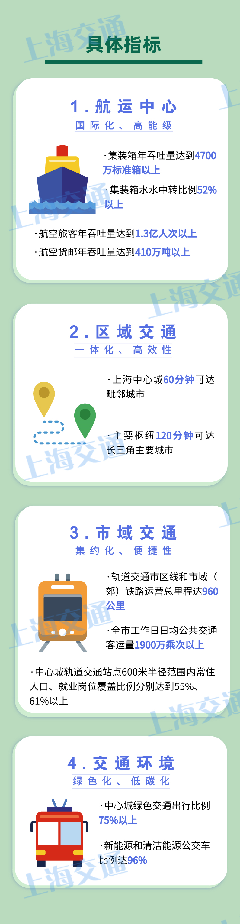 发展目标是:打造“立体融合、人本生态、智慧高效”的高质量、现代化综合交通体系,实现国际航运中心世界一流,区域一体化交通互联互通水平全国领先,综合运输服务品质一流,交通治理能力全面现代化。