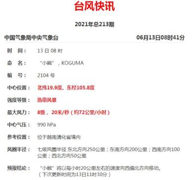 6月12日16时,南海热带低压升级为今年第4号台风“小熊”(热带风暴级,名字来源于日本,小熊星座)。今早8点,其中心位于越南,中心最大风力8级,20米/秒(约72公里/小时),中心气压990hPa。