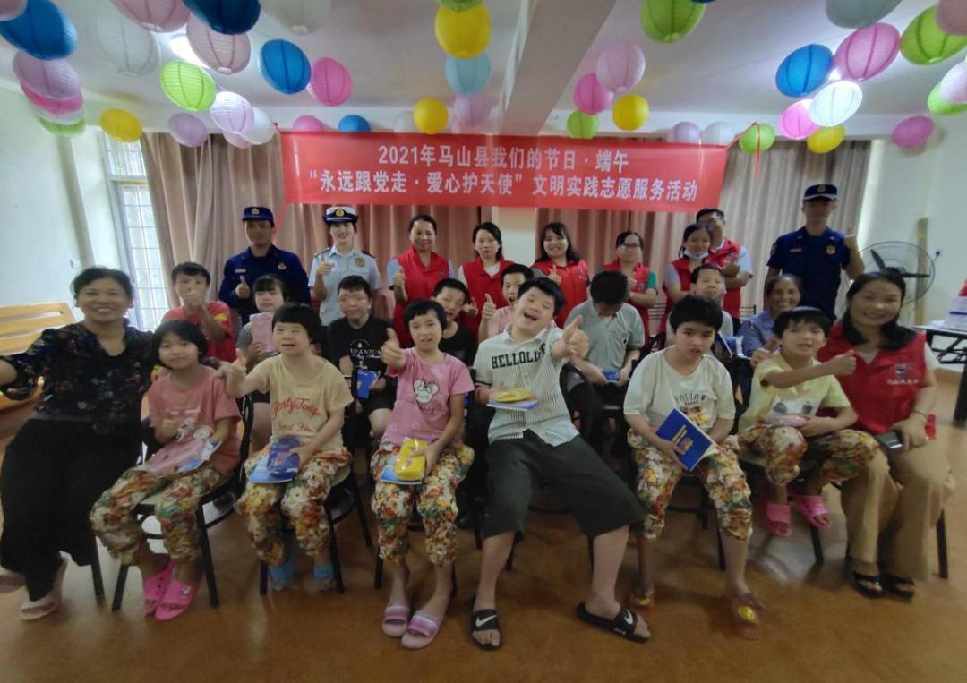 端午节来临之际,南宁市马山县消防救援大队联合县新时代文明实践中心志愿服务总队、县委宣传部、县创城办志愿者来到马山县残疾儿童爱心屋开展我们的节日—端午“永远跟党走 爱心护天使”文明实践志愿服务活动,给残疾儿童送去生活用品、学习用品,送去消防安全知识,与“小天使们”一起传承传统文化,共庆端午佳节。