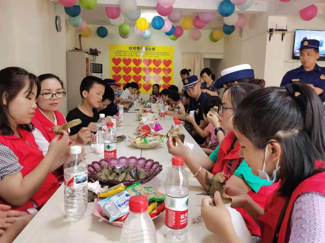 活动现场,指战员与孩子们一同参与“赛龙舟”“画端午”等活动,欢声笑语充满了整个爱心屋。最后,所有人围坐在一起享用着粽子,画面十分温馨。
