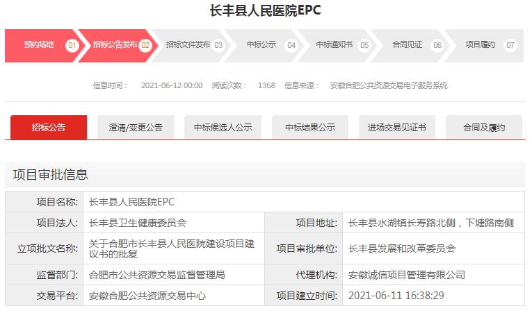 长丰县人民医院EPC合同估算价63245.9万元,计划工期800日历天,项目占地60亩,总建筑面积约7.7万平方米 ,地上最高15层。