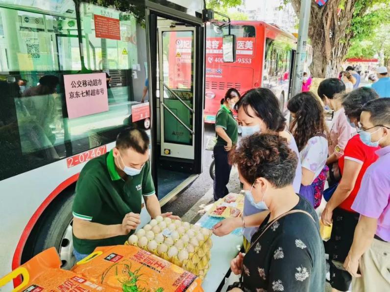 从端午前夕6月9日开始,公交集团推出“公交移动超市”服务,用公交车把食品和日用品送进管控区,助力居民解决采购难题。目前,6台“公交移动超市”专车已覆盖试点区域(石围塘街道)的6个街区, 6月9日至11日,“公交移动超市”共供应肉类13475斤、蔬菜29793斤、米面8671斤以及大批食用油、鸡蛋、水果等物资。从6月4日起,组织8台巴士畅捷“爱心大篷车”进入荔湾区冲口街道,在多个小区开设食品和生活用品保障供应点,服务居民近2.3万人次。适逢端午节,“爱心大篷车”还特意带去各种口味的粽子,受到居民的欢迎。从6月4日起,在羊城通穗康生活平台,提供平台线上下单和集中配送服务,已为管控区成功配送超过11吨生活必需品。从6月9日起,为实行封闭管理的鹤园小区居民配送一日三餐,配送量每天约9000份,一直持续到小区封闭管理结束。
