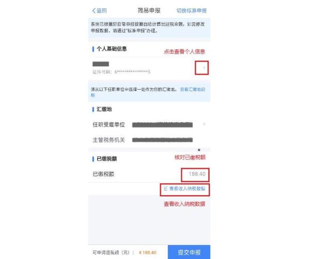 进入简易申报界面,对界面显示的个人基础信息、汇缴地、已缴税额进行查看、确认。纳税人对相关信息确认无误后,点击【提交申报】。