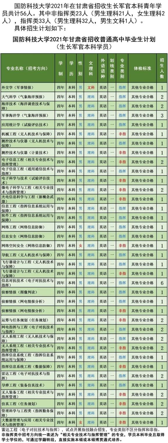 甘肃省教育考试院6月13日发布的国防科技大学2021年招收普通高中毕业生计划(生长军官本科学员)显示,该校2021年在全国30个省(市、区)面向普通高中毕业生招收2400名(男生2259人、女生141人)生长军官本科学员,其中,在甘肃省招收生长军官本科青年学员共计56人。非指挥类23人(男生理科21人,女生理科2人),指挥类33人(男生理科32人,男生文科1人)。